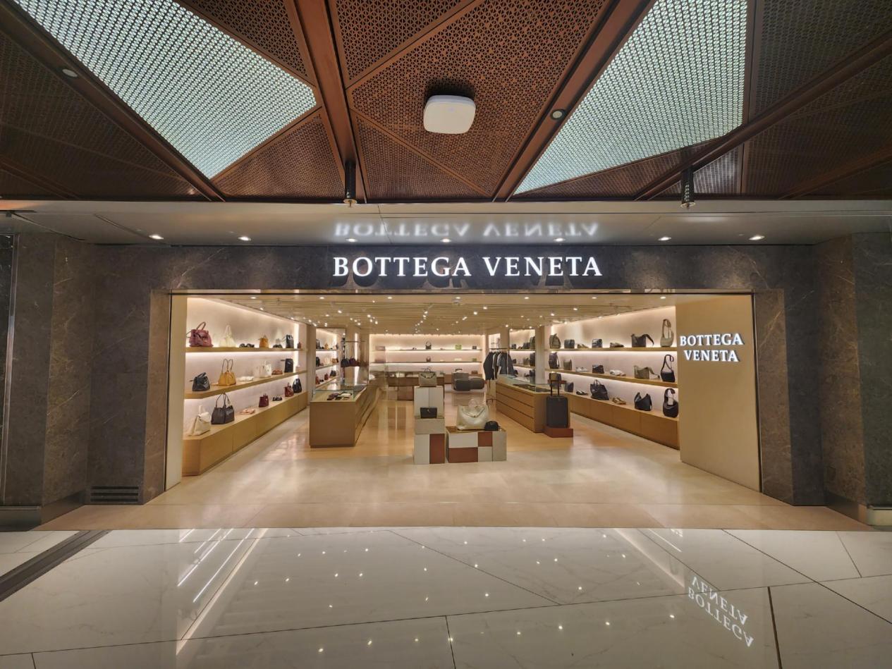 与前两者在设计取向上形成对照的,是Bottega Veneta(葆蝶家)。品牌以低调克制的设计语言著称,主打标志性的编织皮具,并同步呈现成衣、鞋履及配饰系列。店铺空间设计强调纯粹与秩序感,减少装饰元素,通过材质、光线与陈列方式突出产品轮廓与工艺细节,进一步丰富了购物区在品牌结构与风格层次上的多元性。