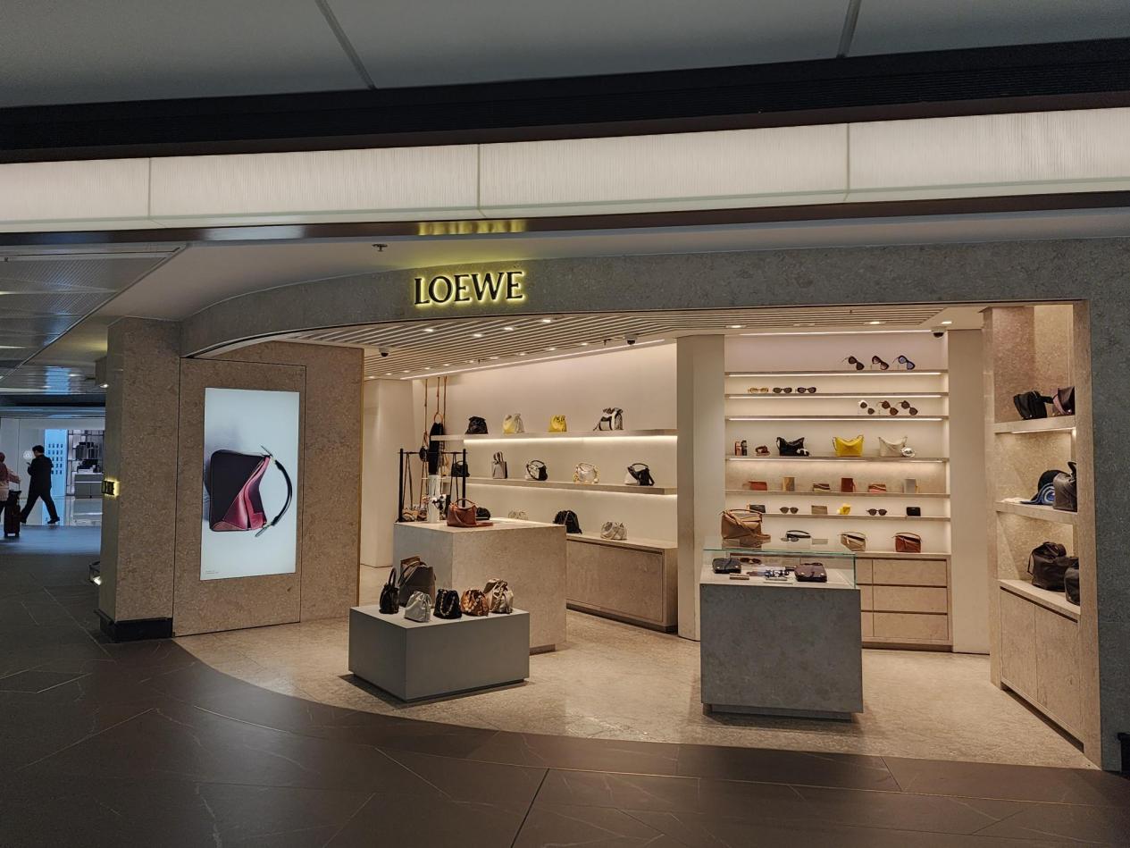 在此基础上,LOEWE(罗意威)在品牌风格与空间氛围上提供了不同的选择。店铺以品牌标志性的皮具系列为核心,同时展示成衣及配饰产品。品牌风格注重设计表达与手工工艺,强调皮革质感与结构细节。空间设计理念以简约为主,通过自然材质与柔和色调的搭配,突出产品本身的工艺特点,为旅客提供相对安静、专注的购物体验。
